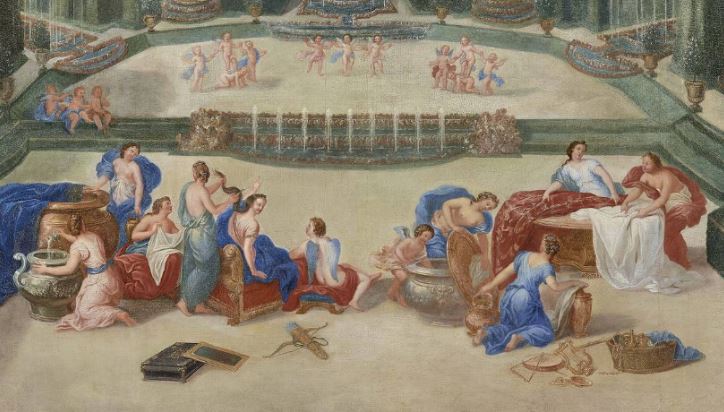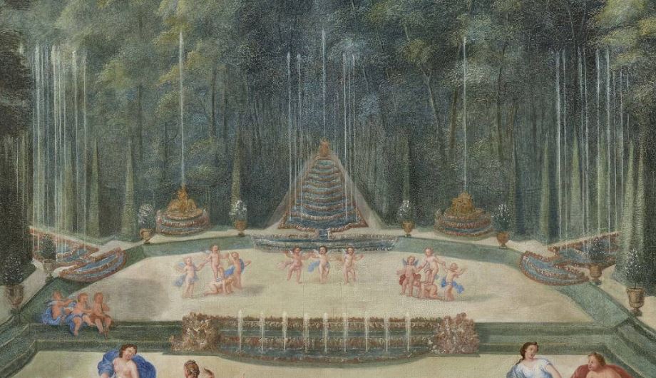 vue d'architecture (parc : Versailles, décor de jardin, fontaine, bassin d'eau) ; vase ; Vénus (toilette) ; serviteur ; siège ; table ; danse