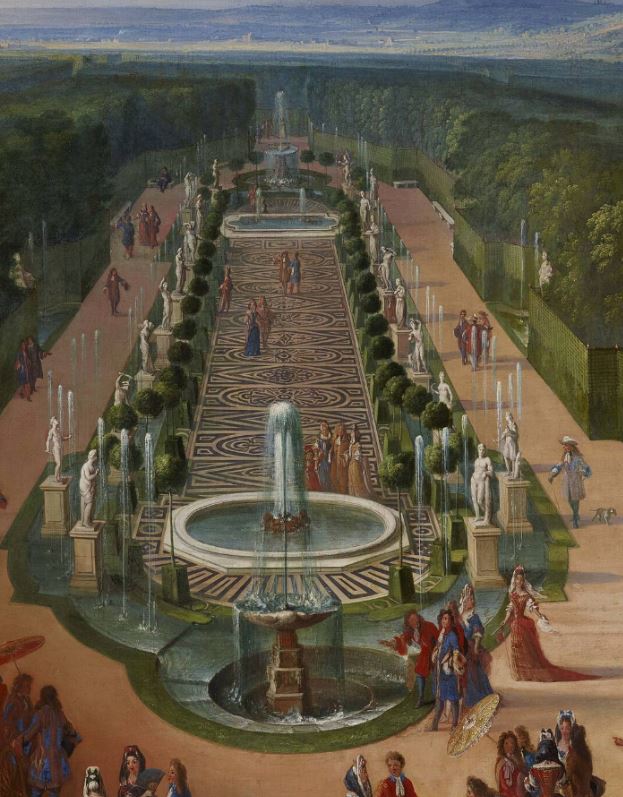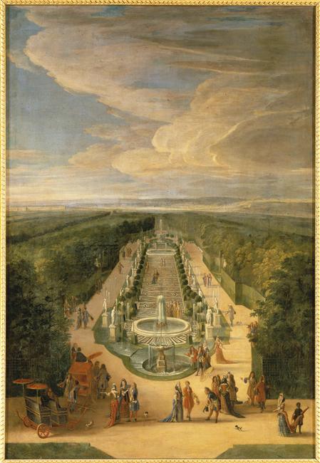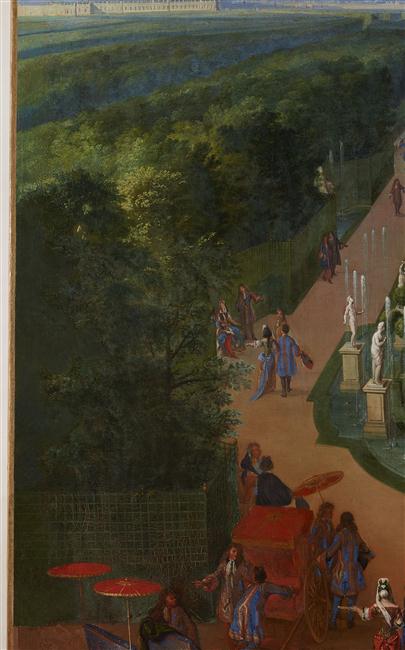 vue d'architecture (parc : Versailles, décor de jardin, bassin d'eau, fontaine, statue, oranger, noblesse, esclave, esclavage) ; ombrelle ; voiture à bras