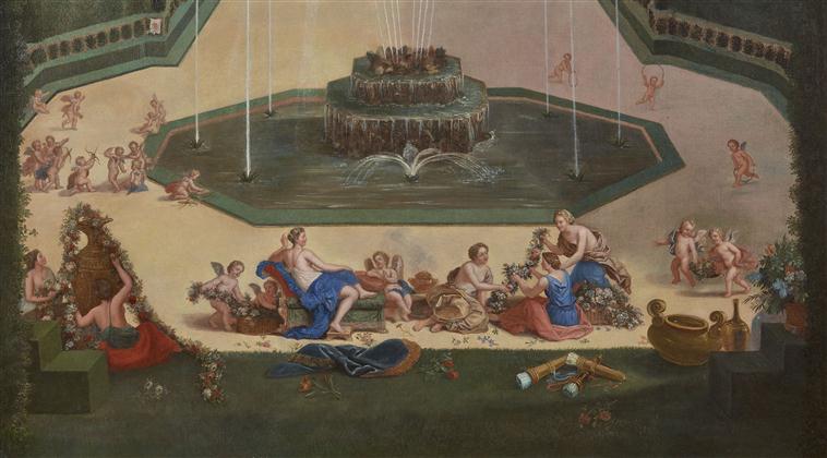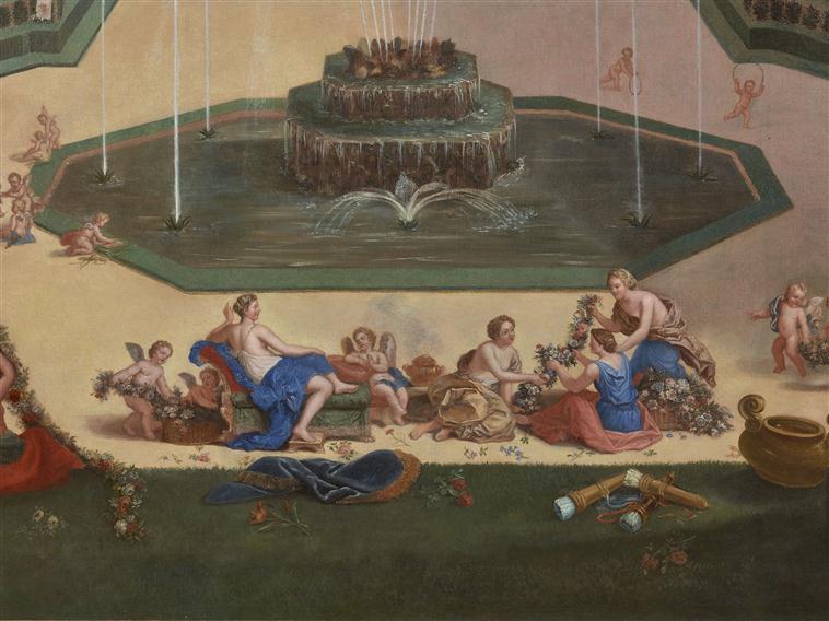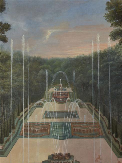 paysage (parc : Versailles, bassin d'eau, fontaine, jet d'eau) ; scène mythologique (putti, divinité, arme, vaisselle, siège)