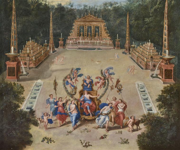 paysage (Versailles, parc, bassin d'eau, fontaine, portique, divinité, char, serviteur, putti, chien, gibier, arme)