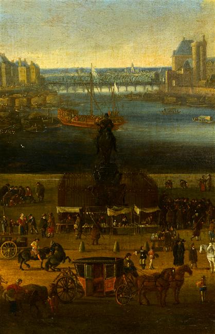 paysage (vue d'architecture, ville : Paris, palais, statue : Henri IV, attroupement, carrosse, échoppe, bateau, charrette, pont)