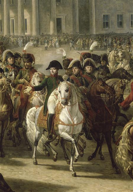 scène historique (visite officielle, cortège, Berlin, attroupement, arc, soldat, Berthier Louis Alexandre, Davout Louis Nicolas, Augereau Charles Pierre François, Caulaincourt Armand Augustin Louis marquis de, Lefebvre François Joseph, Duroc Géraud Christophe Michel)