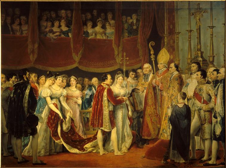 scène historique (mariage, Napoléon Ier, Marie-Louise de Habsbourg-Lorraine, ministre, officier, cardinal, évêque, haut fonctionnaire : diplomatie, famille, salon, palais, Paris, autel, loge, draperie, habillement, bijou, Bonaparte Jérôme, Bonaparte Louis, Bonaparte Elisa, Bonaparte Caroline, Bonaparte Pauline, Bonaparte Marie Laetitia, Beauharnais Eugène de, Beauharnais Hortense de, Murat Joachim, Fesch Joseph, Bavière Auguste Amélie de, Bade grande duchesse de)