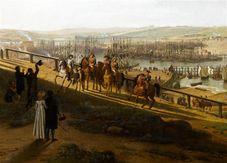 scène historique (Napoléon Ier, cheval, état-major, marine, lettre, port, bateau)