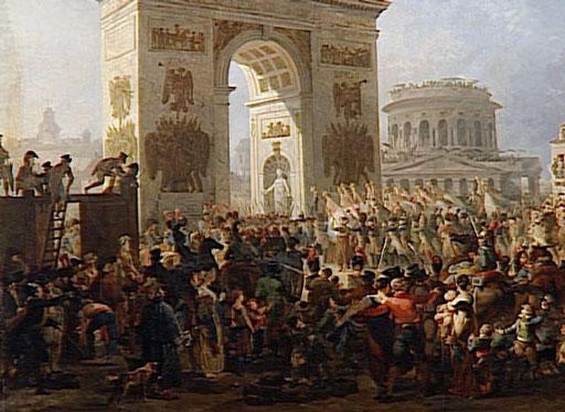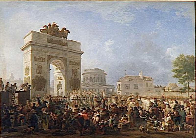 scène historique (défilé, arc monumental, infanterie, cavalerie, attroupement, commerçant, couple, charpentier, ville, Bessières Jean-Baptiste, maréchal, haut fonctionnaire, Frochot Nicolas Thérèse Benoît comte)