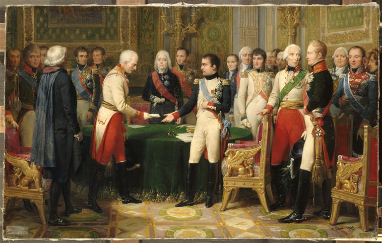 scène historique (Napoléon Ier, ambassadeur, entrevue, roi, ministre, Allemand, Autrichien, Prussien, habillement, décoration, siège, tapis, tenture, éclairage, Talleyrand-Périgord Charles Maurice de, Goltz August von der, Guillaume Ier de PRusse : enfant)