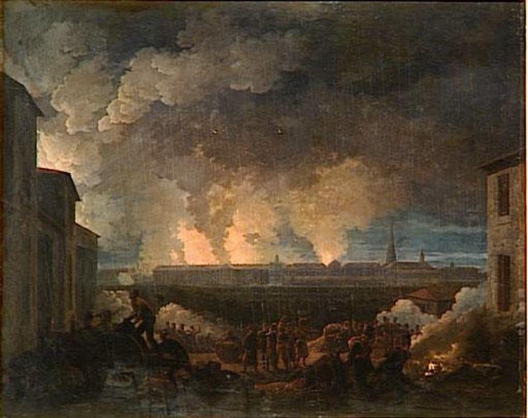 scène historique (guerre de siège, ville, incendie, tente, nuit)