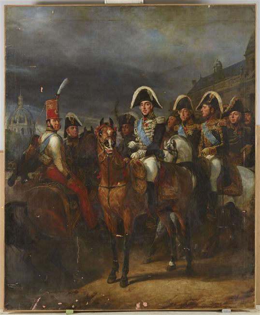 scène historique (revue : Charles X, état-major : cavalier, maréchal, Angoulême duc d', Orléans duc d', Bourbon duc de, Tarente duc de, Reggio duc de, Fitz-James duc de, Maillé duc de, habit : officier, Ordre du Saint-Esprit, chapeau, vue d'architecture)