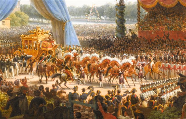 scène historique (porte de ville, foule, cavalcade, harnachement, carrosse : Charles X, soldat, arrivée, acclamation)
