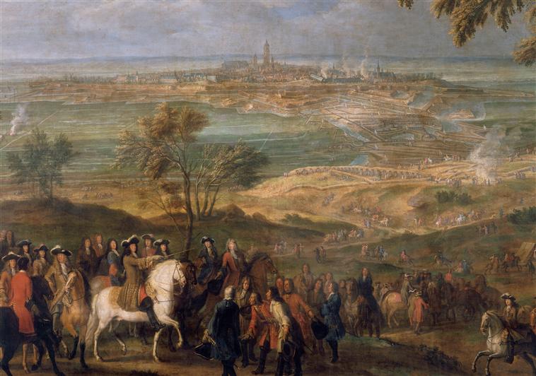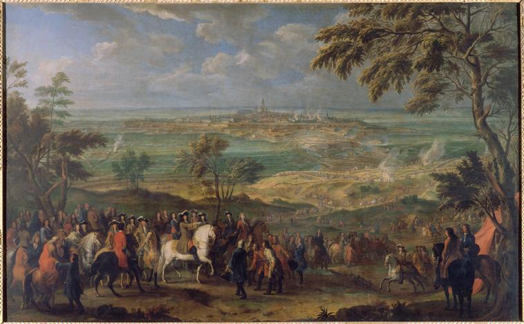 scène historique (prise de place : Mons-en-Hainaut, Louis XIV, prince héritier, Orléans duc d', état-major, cavalier, attroupement, tente, canon, mouvement d'armée, tranchée : plan, fortification : plan, ville, plaine) ; Luxembourg duc de ; maréchal ; La Feuillade duc de