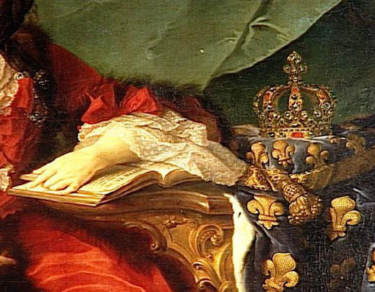 portrait (Marie Leczinska, femme, assis, en pied, de trois-quarts, coiffe, robe, dentelle, couronne, livre, bijou, manteau, fourrure : hermine, siège, table, effet de tissu, élément d'architecture)