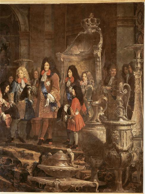scène historique (entrevue : Louis XIV, magistrat : Gênes, soumission, prince héritier, Orléans duc d', réunion : noblesse, mobilier : argent, trône, vaisselle, habit, Ordre du Saint-Esprit, Duras duc de, Imperiali Francesco Maria, haut fonctionnaire)