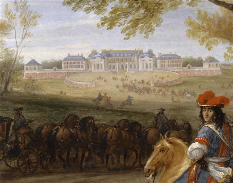 vue d'architecture (château : Versailles, façade, cour, carrosse, cavalier)