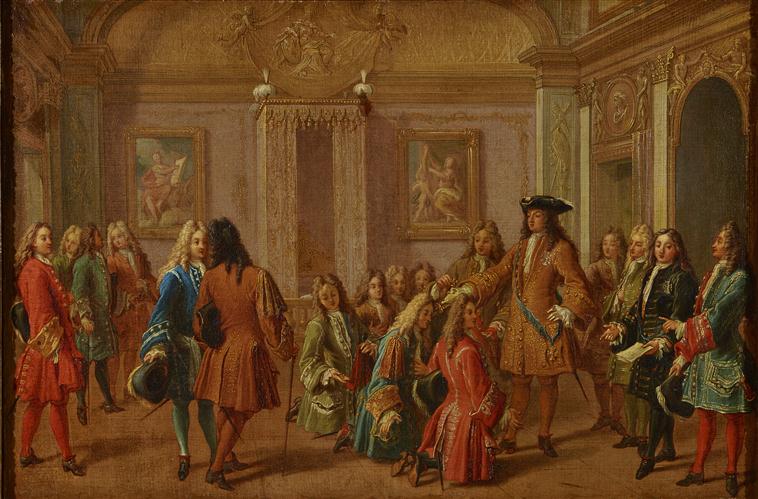 scène historique (fondation : Ordre de Saint-Louis, Louis XIV, noblesse, chevalier : agenouillé, accolade, vue d'intérieur : Versailles, chambre, peinture : Domenichino, peinture : Raphaël)