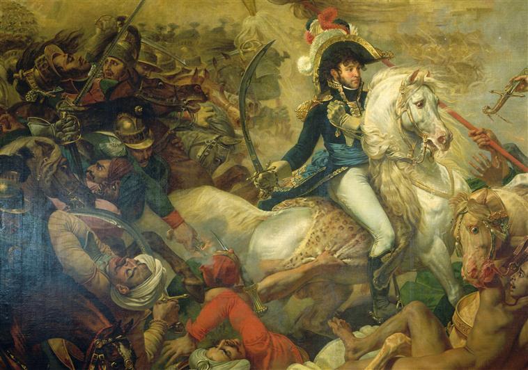 scène historique (campagne d'Egypte, bataille : Aboukir, assaut : cavalerie, infanterie : Arabe, mort, blessé, Murat Joachim, ville : fortification, camp militaire, mer)