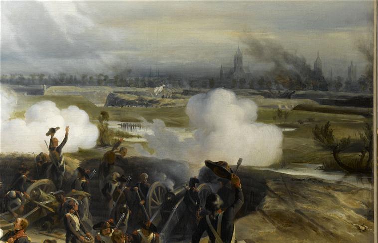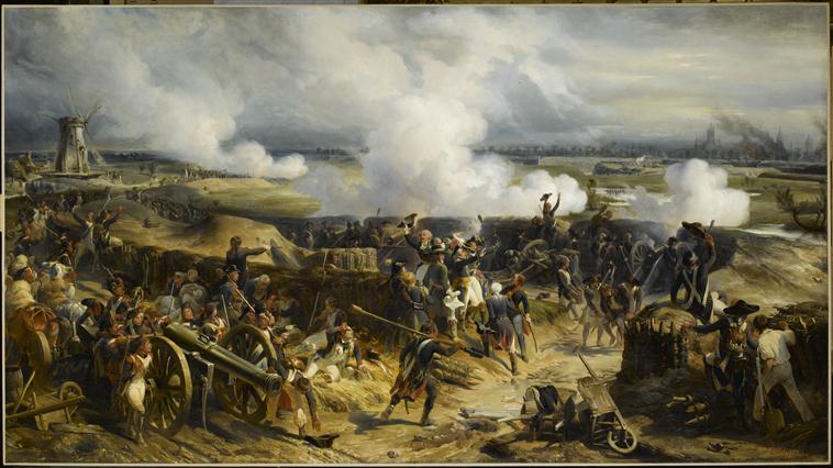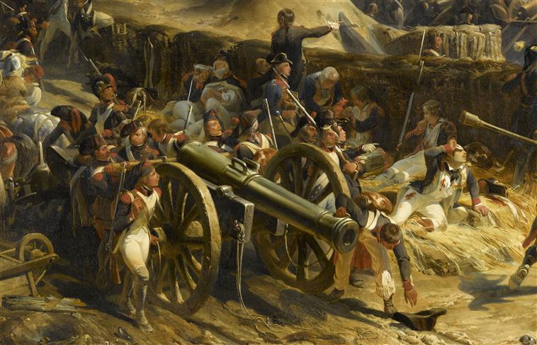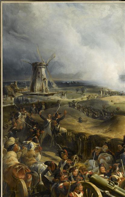 scène historique (prise de place : Ypres, Belgique, reddition, joie, tranchée, canon, infanterie, Moreau Jean Victor, état-major, blessé, brouette, ville, moulin, fortification, drapeau)