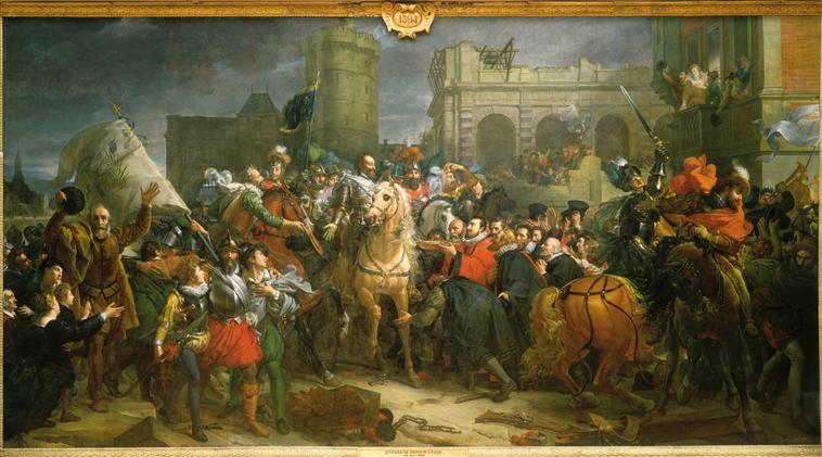 scène historique (prise de place, remise des clés, Paris : palais, Henri IV, Brissac duc de, Montmorency Henri Ier de, Crillon seigneur de, Retz duc de, Sully, Estrées Gabrielle d', Matignon Jacques de, Espinay François d', Néret Mr, acclamation, accolade, soumission, protection, fortification, foule, habit : magistrat, armement)