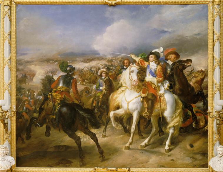 scène historique (bataille : Lens, Condé prince de, état-major : cavalier, armure, casque)