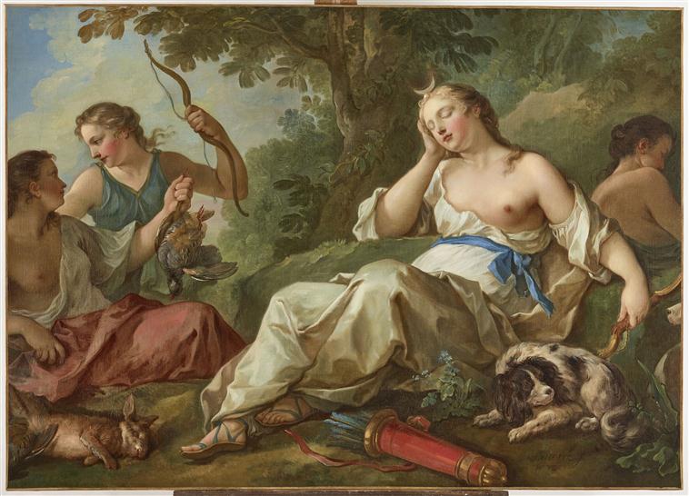 scène mythologique (repos : Diane, chasse, chien, gibier, arc, carquois)