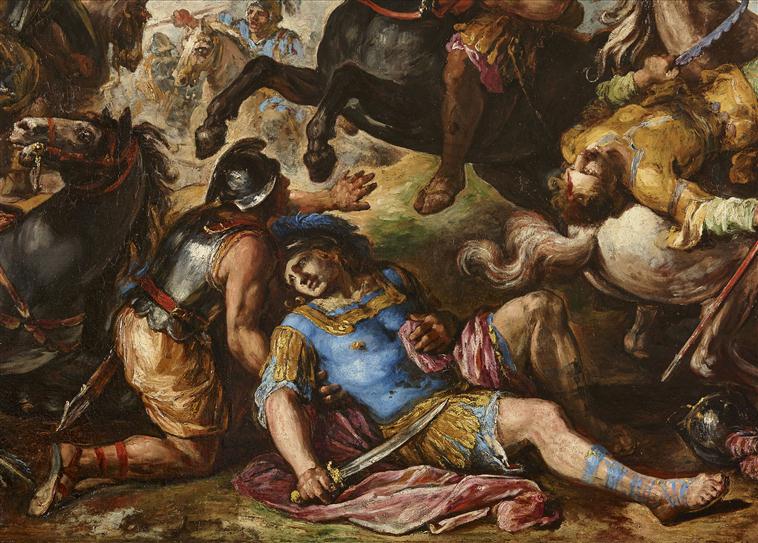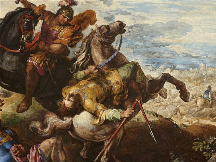 scène (combat : cavalerie, armure, casque, épée, lance, blessé)