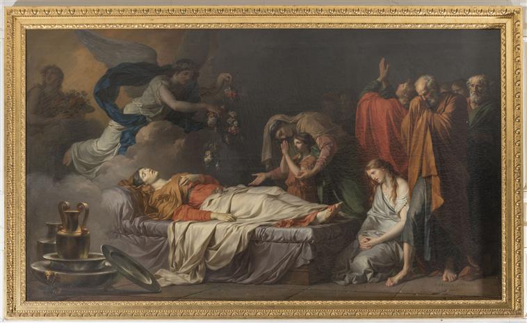 scène biblique (mort : Vierge, apôtre, femme, enfant, lit, vaisselle, nuée, ange, fleur, effet de tissu)