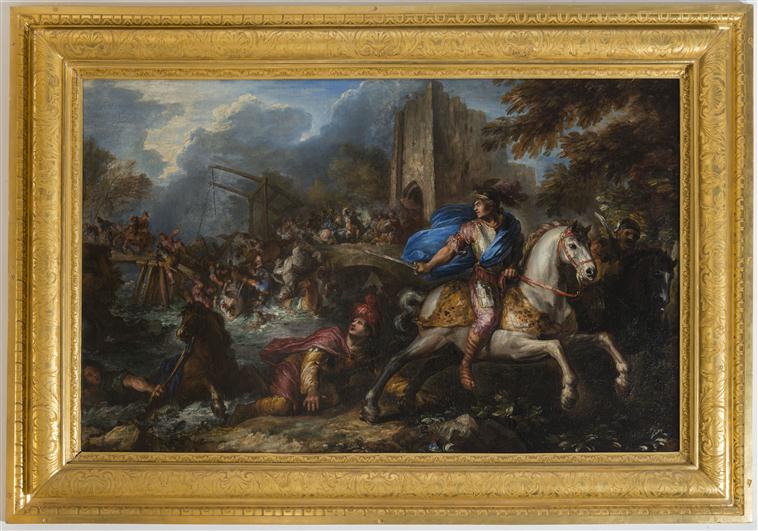 scène (assaut : cavalerie, armure, casque, épée, fortification, pont, chute)