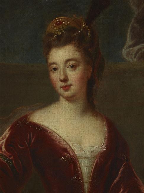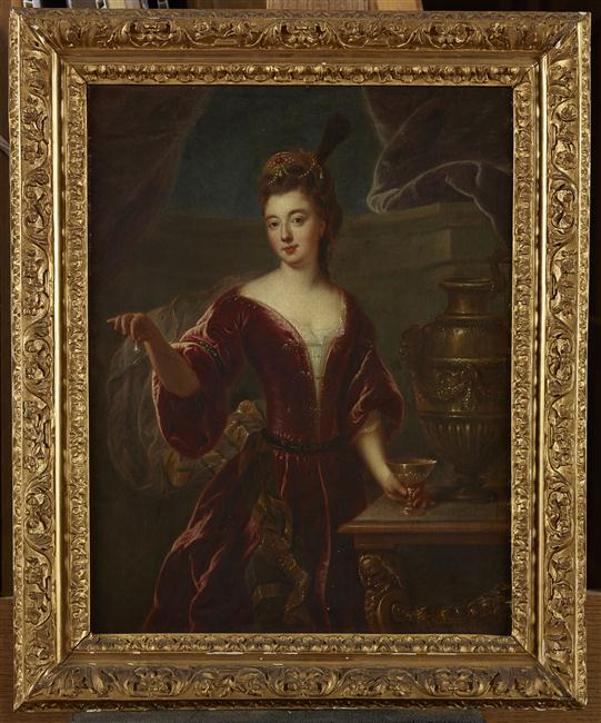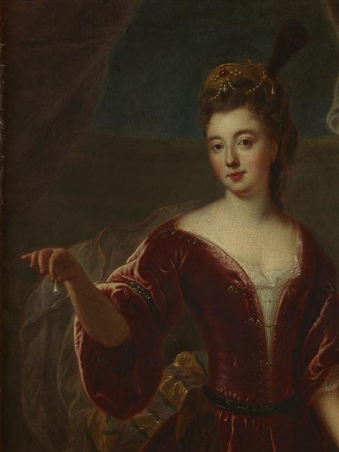portrait (Bourbon Anne Louise Bénédicte de, Maine duchesse du, représentée en : Cléopâtre VII, femme, à mi-corps, de trois-quarts, perle, verre à pied, vase)