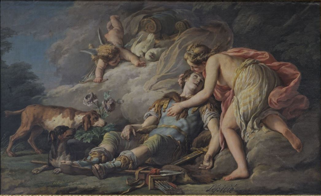 scène mythologique (mort : Adonis, Vénus, armure, lance, épée, carquois, colombe, chien, char, anémone)