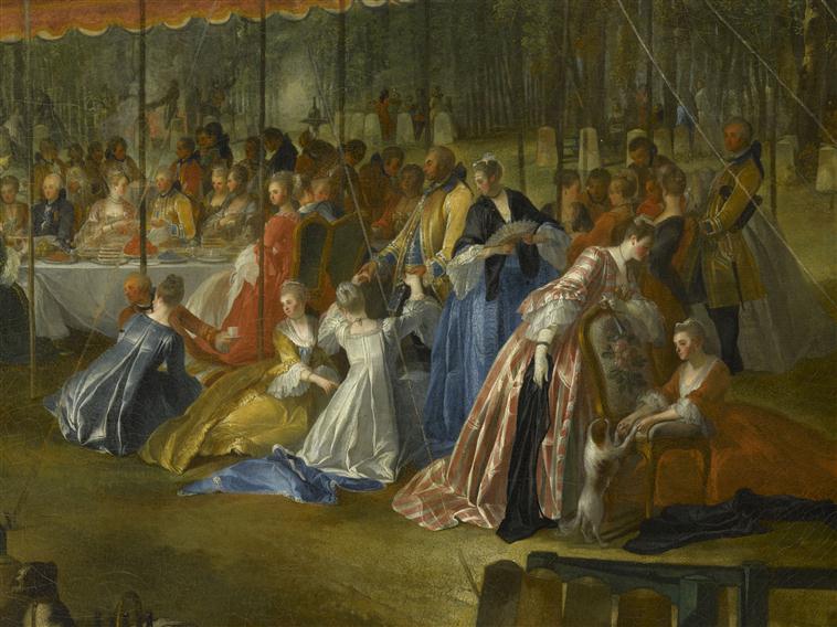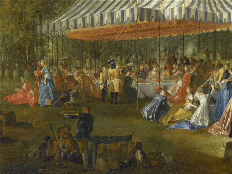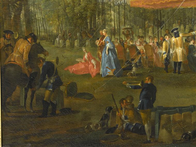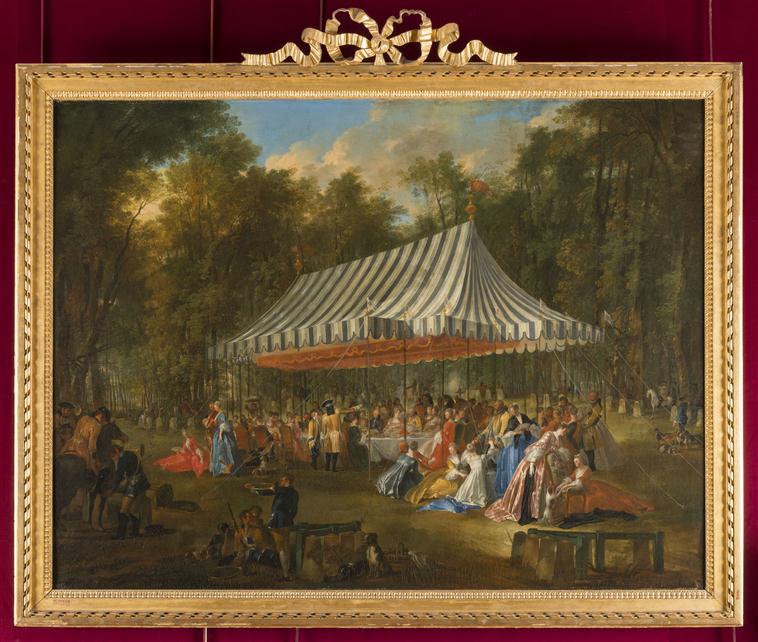 scène historique (fête champêtre : L'Isle-Adam, Conti prince de, Brunswick-Lünebourg prince de, repas, assemblée : noblesse, tente, vêtement, cavalier, trompe, forêt, chien)