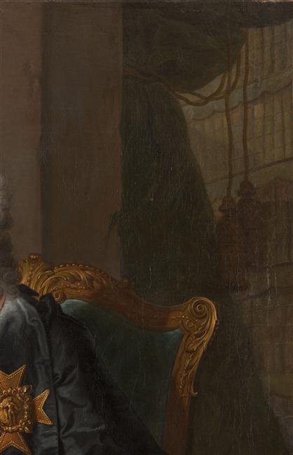 portrait (Voyer de Paulmy Marc Pierre de, Argenson comte d', ministre, homme, assis, à mi-corps, de trois-quarts, Ordre de Saint-Louis, habit : parlementaire, siège, table)