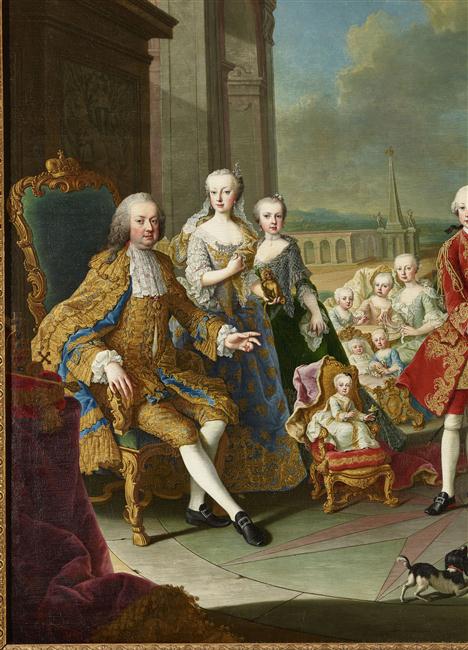 portrait collectif ; François Ier de Habsbourg-Lorraine (homme, assis, de trois-quarts) ; Marie-Thérèse d'Autriche (femme, assis, de trois-quarts) ; Joseph II d'Allemagne (garçon, en pied, de trois-quarts, prince héritier) ; Lorraine Marie Amélie de (fillette, à mi-corps, de trois-quarts, Parme duchesse de) ; Lorraine Marie Caroline Louise de (reine : Naples, reine : Sicile) ; Marie-Antoinette (nourrisson, couché, lit) ; couronne ; vêtement (dentelle, broderie, passementerie) ; siège ; chien ; élément d'architecture