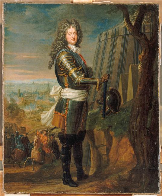 portrait (Orléans Philippe d', Bourbon Philippe de, homme politique, en pied, de trois-quarts, armure, casque) ; tente ; prise de place