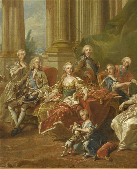 portrait collectif (famille) ; Philippe V d'Espagne (homme, assis, de trois-quarts) ; Elisabeth Farnèse (femme, assis, de trois-quarts, manteau) ; Charles III d'Espagne (homme, en pied, de trois-quarts, accoudé) ; Saxe Marie Amélie de (femme, assis, de face) ; Marie-Elisabeth d'Espagne (fillette, assis, chien, de trois-quarts) ; Espagne Philippe d' (Bourbon Philippe de, prince héritier, homme, amiral, à mi-corps, de trois-quarts) ; France Louise Elisabeth de (femme, Bourbon Louise Elisabeth de, assis, de trois-quarts) ; Espagne Louis Antoine Jacques d' (Bourbon Louis Antoine Jacques de, homme, à mi-corps, de trois-quarts, archevêque) ; Ferdinand VI d'Espagne (prince héritier, homme, en pied, de trois-quarts) ; Espagne Marie Thérèse Antoinette Raphaëlle d' (femme, assis, de face, manteau : fourrure) ; Espagne Marie Madeleine Josèphe Thérèse Barbe d'