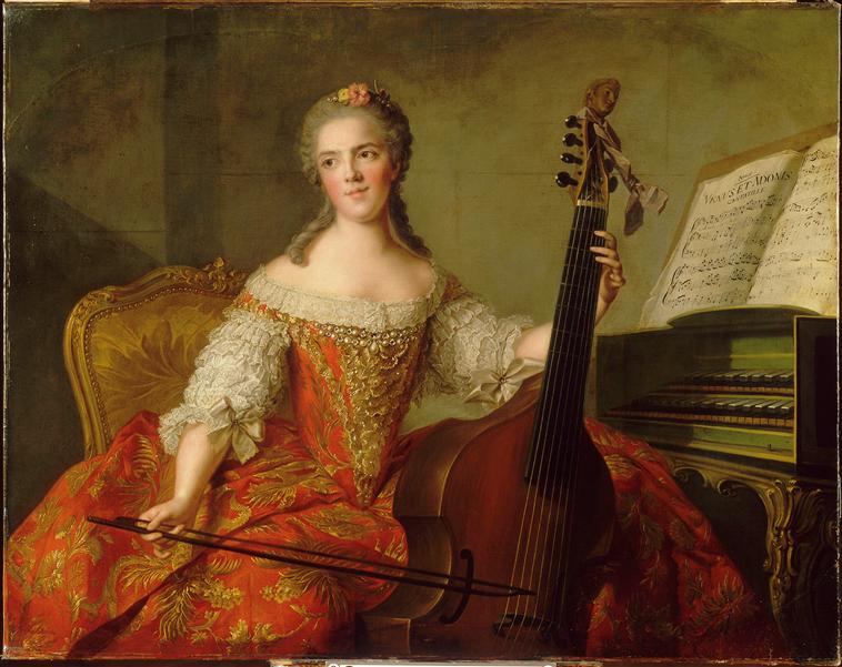 portrait (France Anne Henriette de, Madame Henriette, femme, à mi-corps, de trois-quarts, assis, musicienne : violoncelle, dentelle, bijou) ; clavecin ; partition)