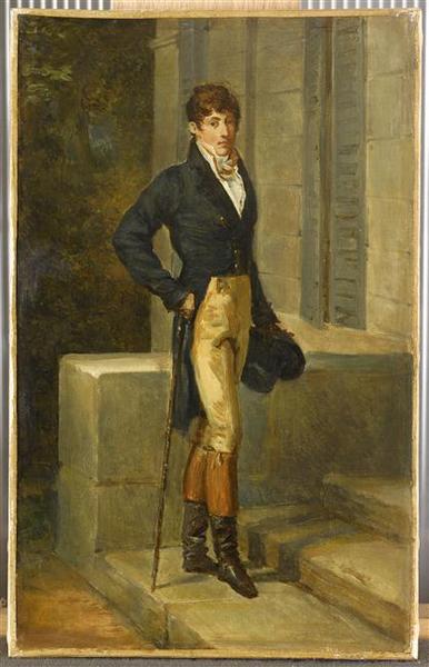 portrait (Imecourt Ferdinand d', officier, homme, en pied, de trois-quarts, canne, chapeau, escalier, façade)