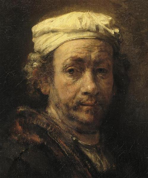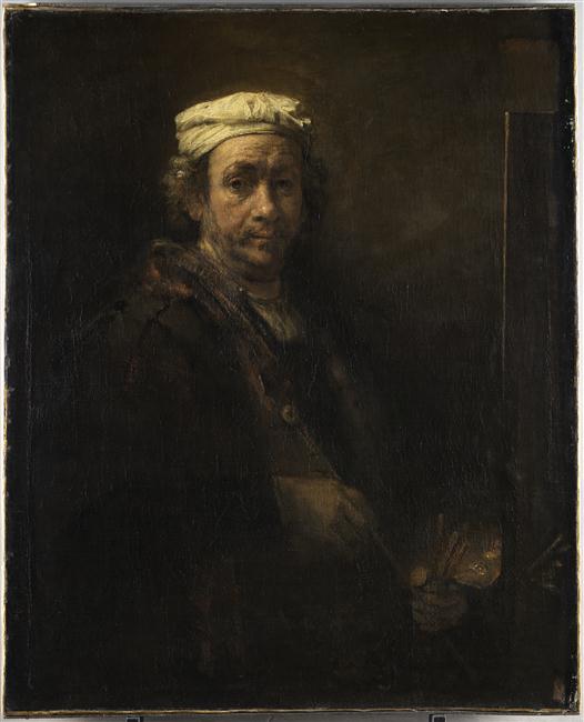 autoportrait (Rembrandt Harmensz Van Rijn, homme, à mi-corps, de trois-quarts, coiffe, chevalet, peintre)
