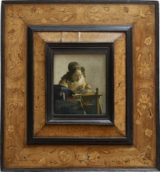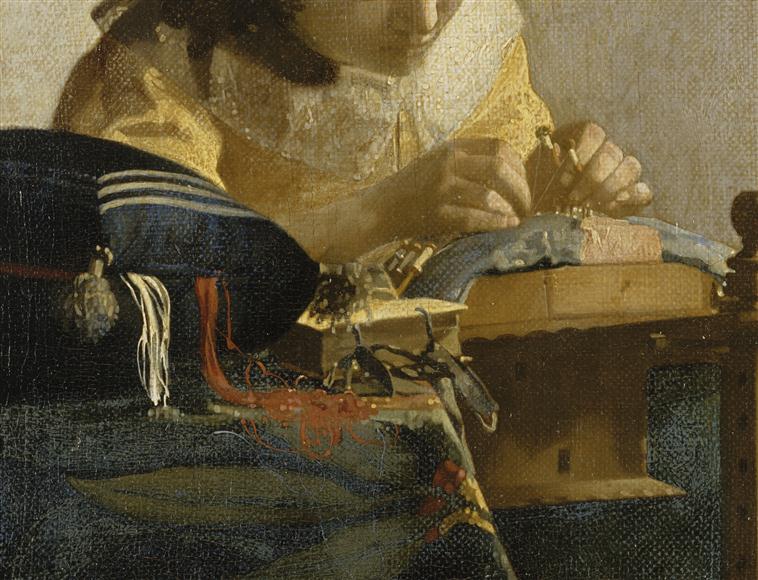 scène (travaux d'aiguille : dentelle, femme, coiffure, table, tapis)