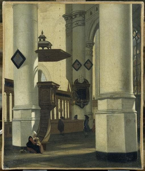 Intérieur d'église avec femme au pied d'une chaire
