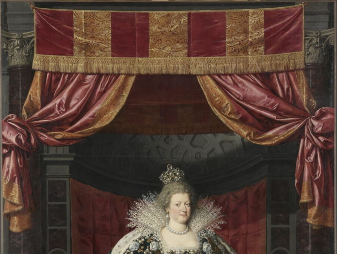 portrait (Marie de Médicis, femme, en pied, de trois-quarts, robe, bijou, col : dentelle, couronne) ; tenture