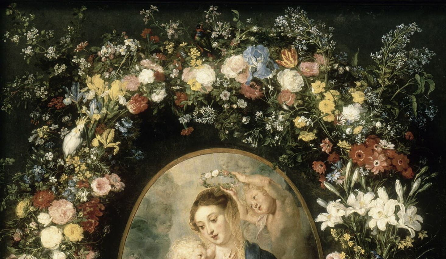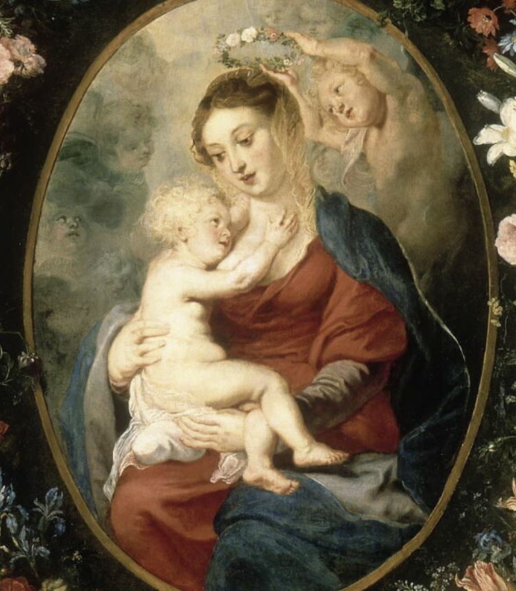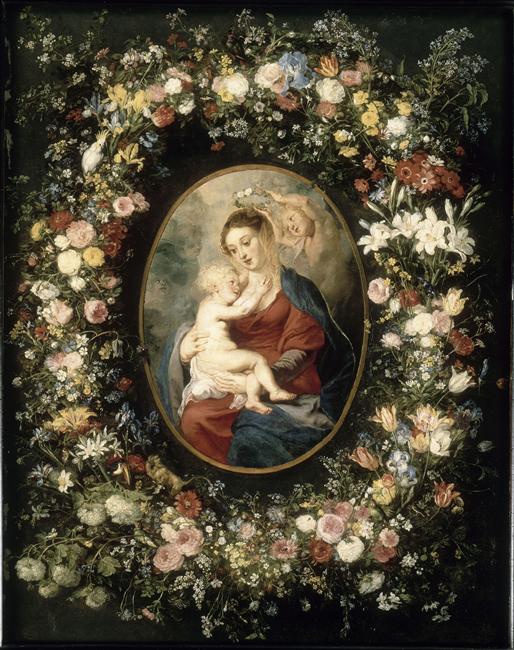 Bruegel dit Bruegel de Velours : Bruxelles, 1568 ; Anvers, 1625 ; la Vierge est de Rubens, la couronne de fleurs de Bruegel