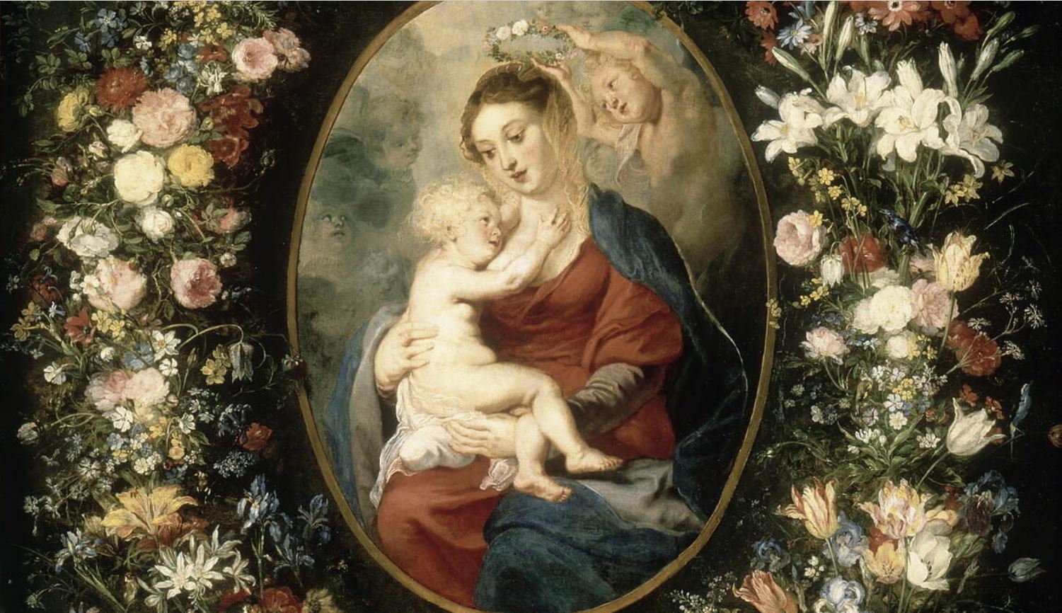 scène biblique (Vierge à l'Enfant, amour maternel, ange, couronne : fleur) ; nature morte (couronne : guirlande, fleur, rose, tulipe, lys)