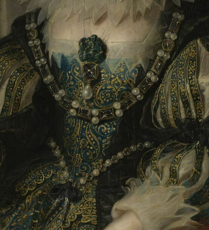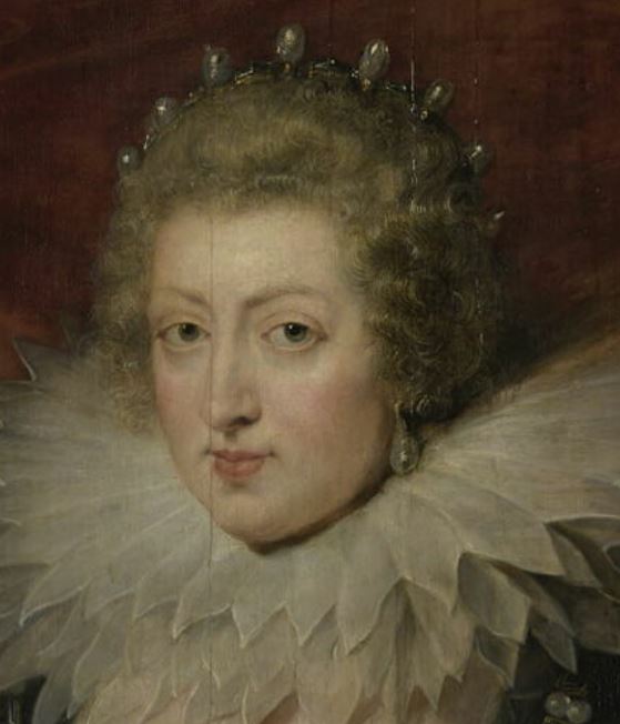 portrait (Anne d'Autriche, femme, assis, à mi-corps, de trois-quarts, col : dentelle, bijou, robe, intérieur) ; élément d'architecture