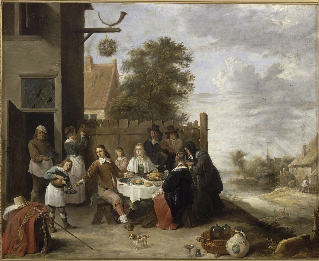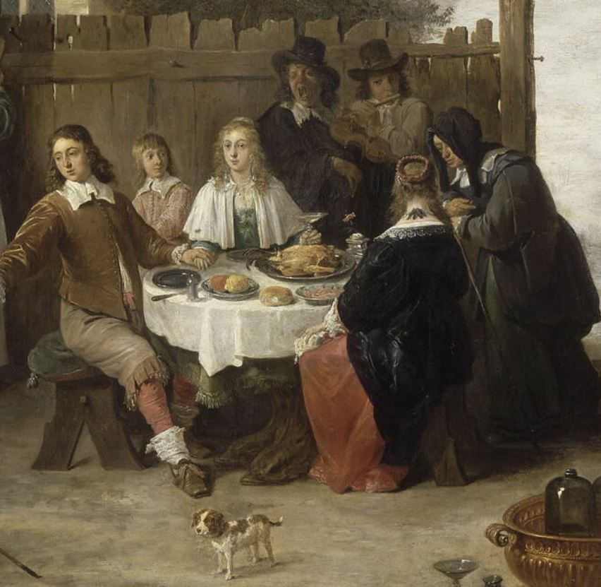 scène biblique (Le fils prodigue) ; scène (repas, homme, femme, récipient : céramique) ; fond de paysage