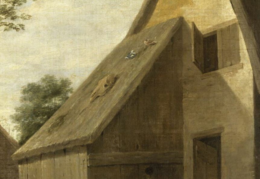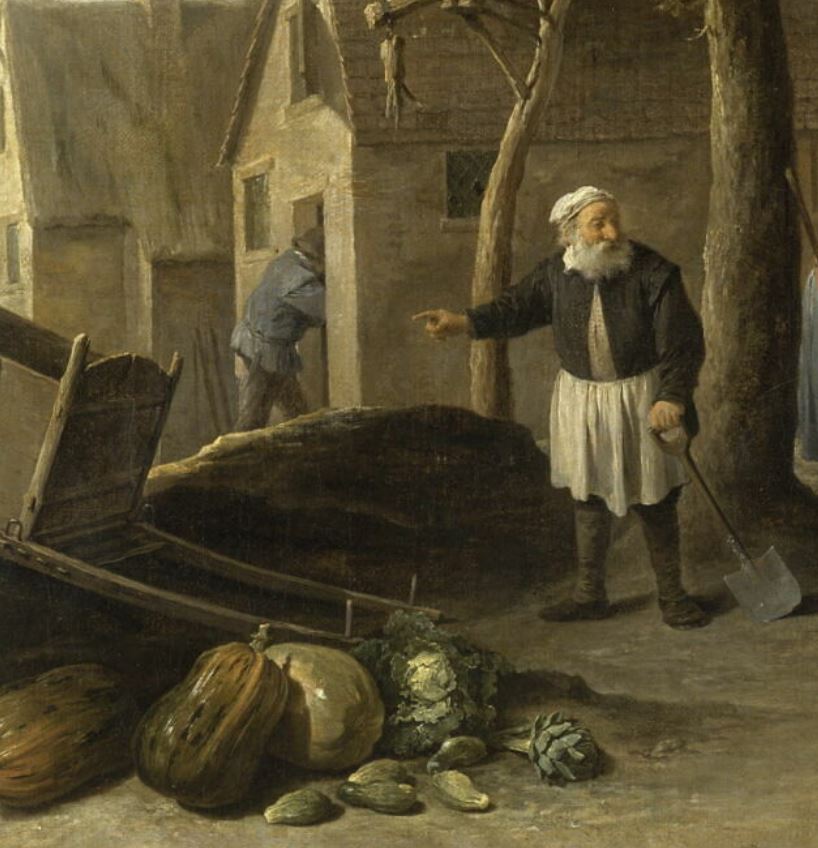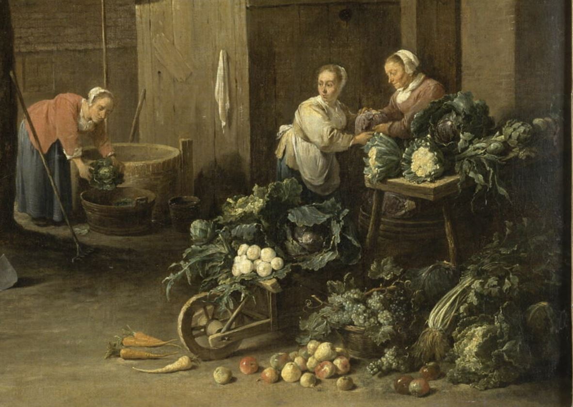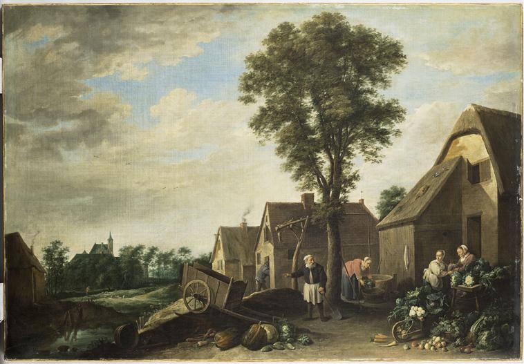 paysage (village, femme, paysan, conversation, charrette) ; nature morte (légume, fruit)