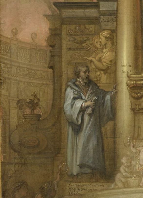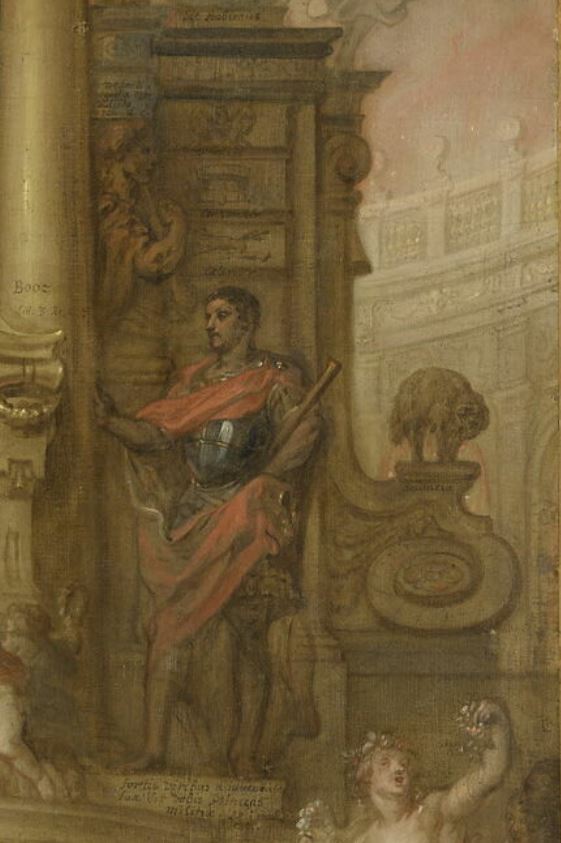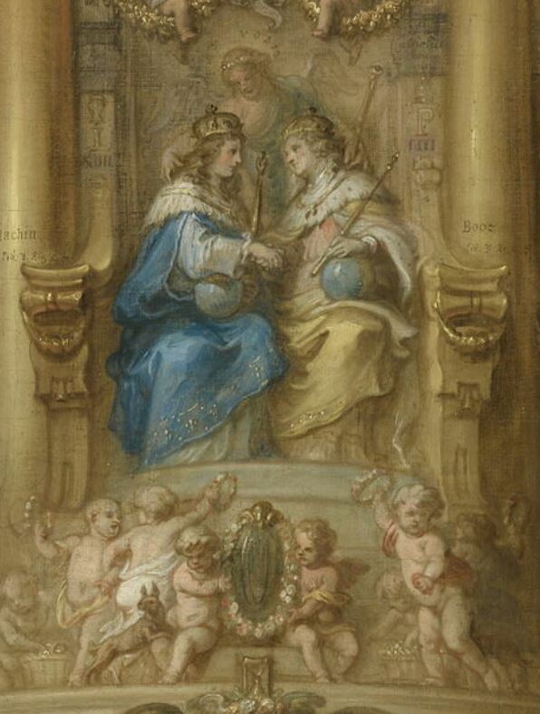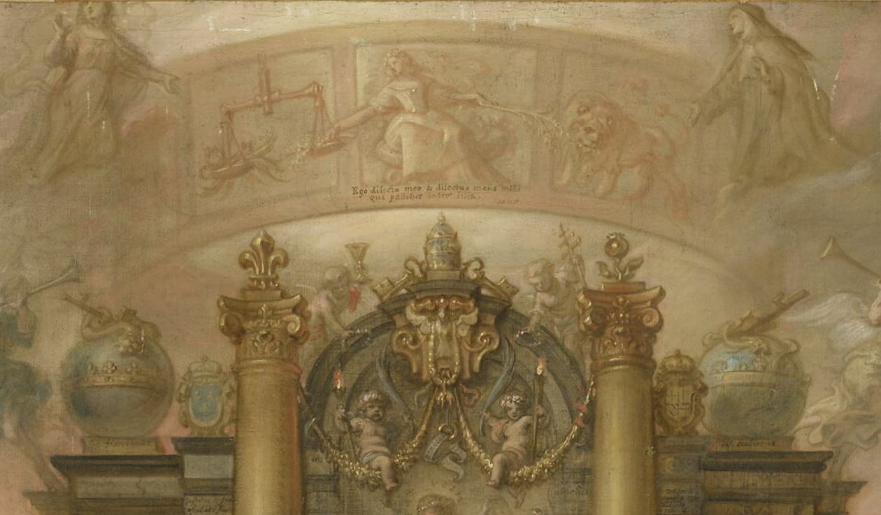 scène historique (Louis XIV, Marie-Thérèse d'Autriche, alliance, allégorie : la paix) ; ornementation (élément d'architecture, armoiries)