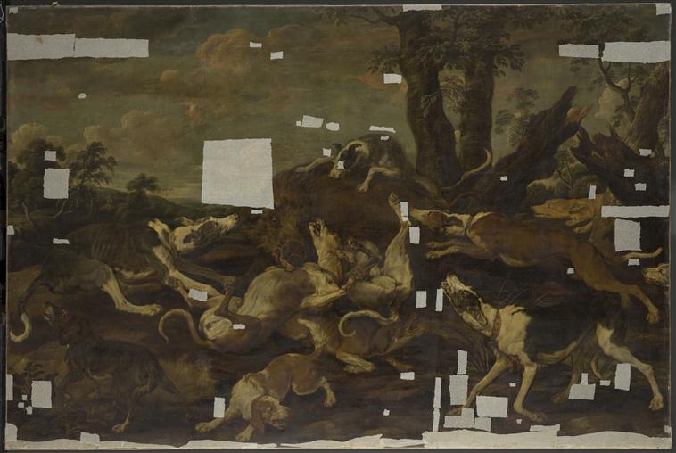 scène (chasse à courre, gros gibier, sanglier, combat, chien, lévrier) ; feuillu
