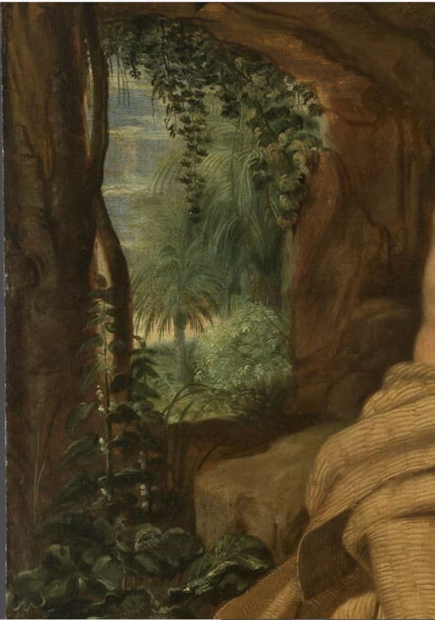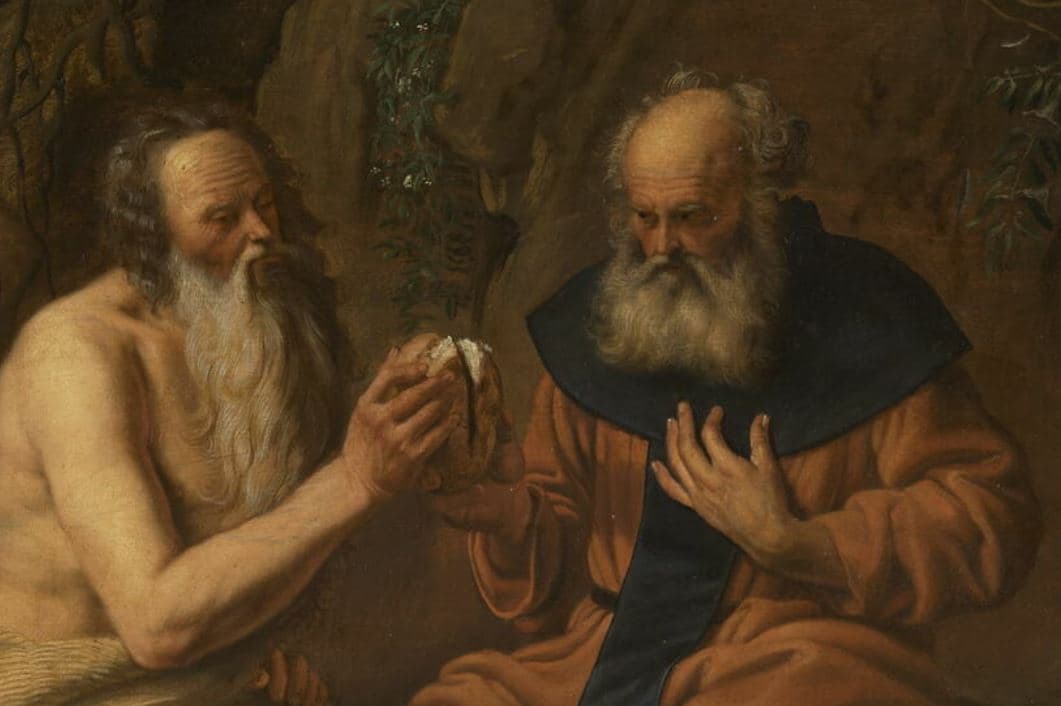 scène biblique (saint Paul ermite, saint Antoine ermite, vieux, corbeau, nourriture, intérieur : grotte)
