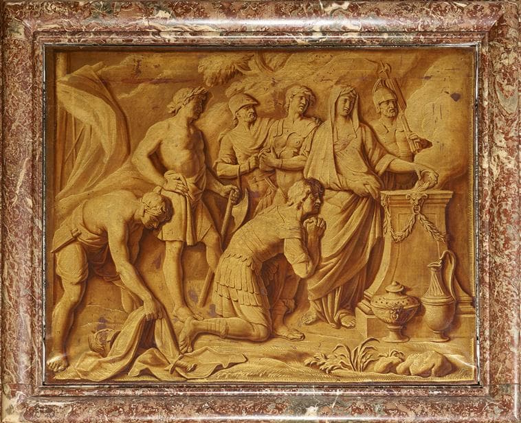 scène (sacrifice, divinité : paganisme, autel : Diane, soldat, vêtement : à l'antique, vase)