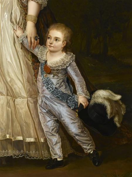 portrait (Marie-Antoinette, femme, en pied, de trois-quarts, dentelle, bijou, chapeau, amour maternel) ; fillette (fleur) ; garçon (chapeau, dentelle) ; jardin (élément d'architecture)