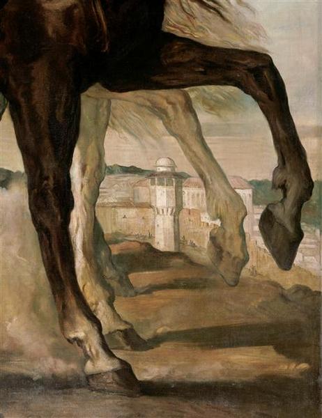 scène ; portrait (Ali ben Ahmed, équestre, homme, Algérien, de trois-quarts, vêtement : à l'orientale, décoration, cheval : harnachement) ; cavalier ; élément d'architecture ; Constantine